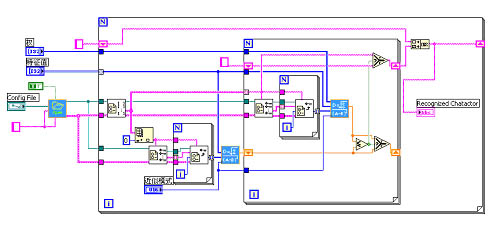 “Process”可以使用户能够在对自动处理的图像不满意的情况下完成手动图像处理,通过扩展该功能可以更加完善系统,提高系统在不同环境下的适应能力;主程序一共具有三个图像显示器,左上方的图像显示器显示的是采集得到的图像或使用“Open”打开的图像,“Open”和“Save”两个按钮对这个图像显示器中的图像进行操作的;左下方的图像显示器显示的是经过图像处理之后的图像,方便用户与原图像进行比较,“Save Image”对这个图像显示器中的图像操作;右侧的小型图像显示器显示的是细化后的单个文字的图像,使得用户可以实时观察细化效果。 在使用识别系统之前,用户需要完成以下几个工作。 1. 启动采集设备,如图像采集卡、摄像头、光源等; 2. 调整好摄像头焦距及位置等,调整光源方向,使得采集具有环境,从而提高系统的识别率。外界环境对于识别率具有举足轻重的作用,一个优良的环境能够大幅提高系统的识别率。 3. 配置好NI的图像采集设备。